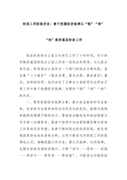 【七哥公文】2024年:财政工作经验发言:善于把握经济规律以“稳”“准”“快”做好基层财政工作+更多免费公文+VX:QiGeGongWen2024
