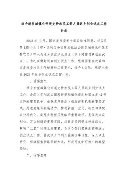 【七哥公文】2024年:结合新型城镇化开展支持农民工等人员返乡创业试点工作计划+更多免费公文+VX:QiGeGongWen2024