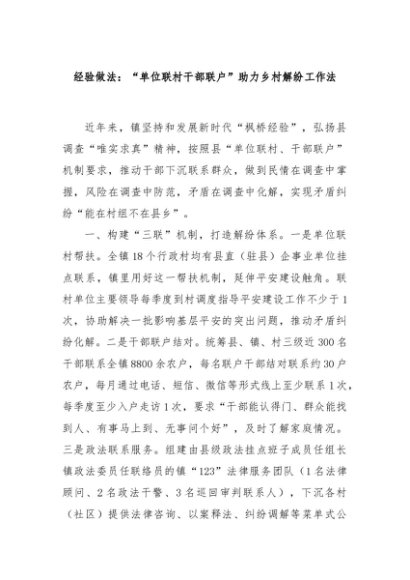 【七哥公文】2024年:经验做法:“单位联村干部联户”助力乡村解纷工作法+更多免费公文+VX:QiGeGongWen2024