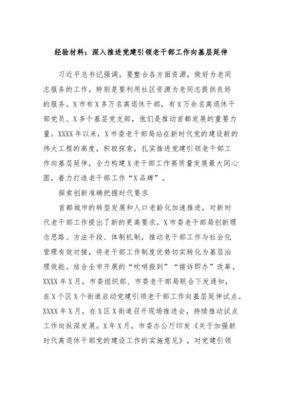 / 【七哥公文】2024年:经验材料:深入推进党建引领老干部工作向基层延伸+更多免费公文+VX:QiGeGongWen2024