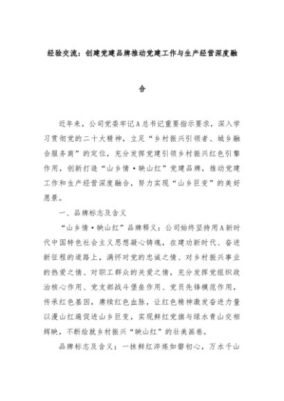 【七哥公文】2024年:经验交流:创建党建品牌推动党建工作与生产经营深度融合+更多免费公文+VX:QiGeGongWen2024