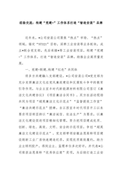 【七哥公文】2024年:经验交流:构建“党建+”工作体系打造“智造安装”品牌+更多免费公文+VX:QiGeGongWen2024