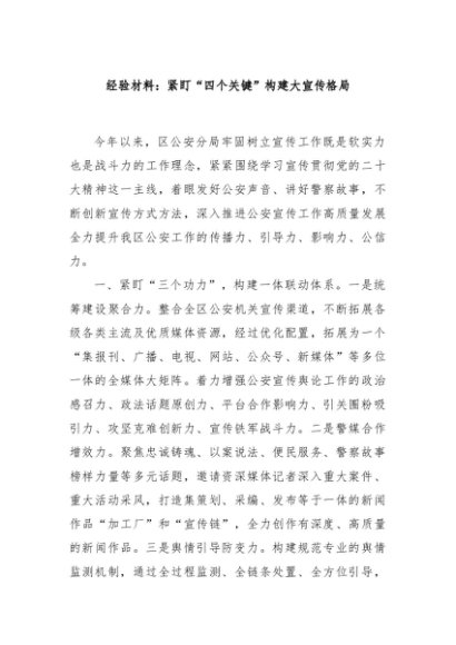 / 【七哥公文】2024年:经验材料:紧盯“四个关键”构建大宣传格局+更多免费公文+VX:QiGeGongWen2024