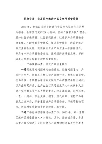 / 【七哥公文】2024年:经验交流:立足民生推进产品全环节质量监管+更多免费公文+VX:QiGeGongWen2024
