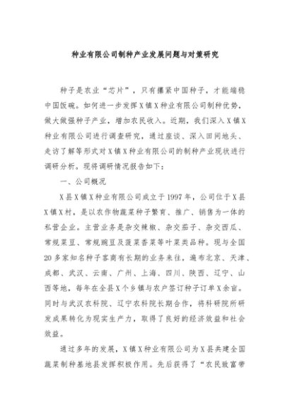 / 【七哥公文】2024年:种业有限公司制种产业发展问题与对策研究+更多免费公文+VX:QiGeGongWen2024