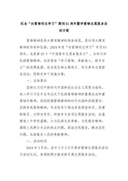 【七哥公文】2024年:纪念“向雷锋同志学习”题词61周年暨学雷锋志愿服务活动方案+更多免费公文+VX:QiGeGongWen2024