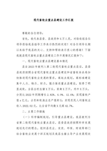 / 【七哥公文】2024年:现代畜牧业重点县建设工作汇报+更多免费公文+VX:QiGeGongWen2024
