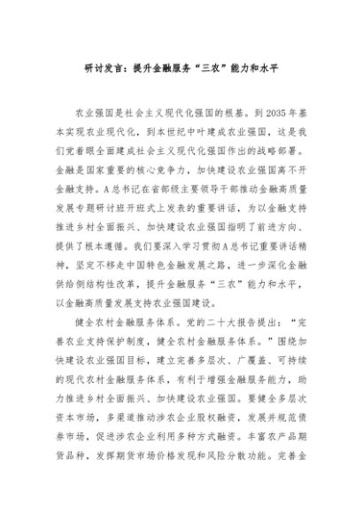 【七哥公文】2024年:研讨发言:提升金融服务“三农”能力和水平+更多免费公文+VX:QiGeGongWen2024