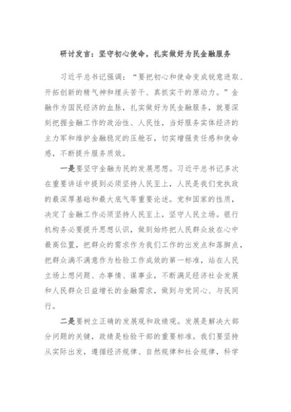 / 【七哥公文】2024年:研讨发言:坚守初心使命,扎实做好为民金融服务+更多免费公文+VX:QiGeGongWen2024