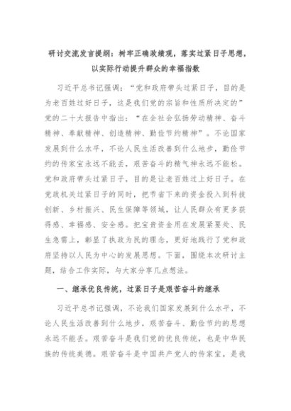 【七哥公文】2024年:研讨交流发言提纲:树牢正确政绩观,落实过紧日子思想,以实际行动提升群众的幸福指数+更多免费公文+VX:QiGeGongWen2024