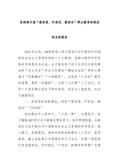 【七哥公文】2024年:某街道开展“感党恩、听党话、跟党走”群众教育实践活动总结报告+更多免费公文+VX:QiGeGongWen2024