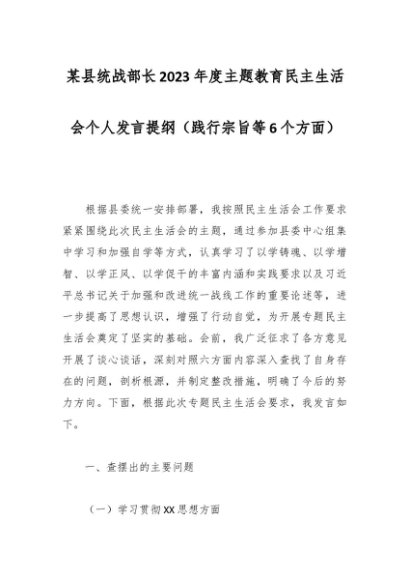 【七哥公文】2024年:某县统战部长2023年度主题教育民主生活会个人发言提纲(践行宗旨等6个方面)+更多免费公文+VX:QiGeGongWen2024