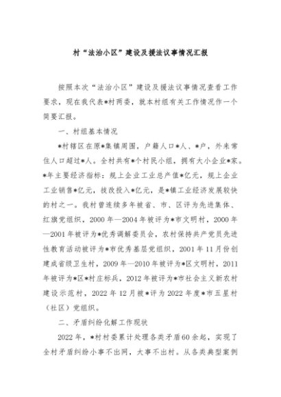 / 【七哥公文】2024年:村“法治小区”建设及援法议事情况汇报+更多免费公文+VX:QiGeGongWen2024