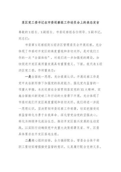 / 【七哥公文】2024年:某区党工委书记在市委巡察组工作动员会上的表态发言+更多免费公文+VX:QiGeGongWen2024