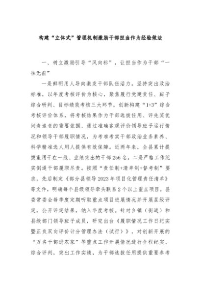 / 【七哥公文】2024年:构建“立体式”管理机制激励干部担当作为经验做法+更多免费公文+VX:QiGeGongWen2024