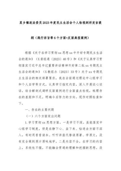 【七哥公文】2024年:某乡镇政法委员2023年度民主生活会个人检视剖析发言提纲(践行宗旨等6个方面+反面典型案例)+更多免费公文+VX:QiGeGongWen2024