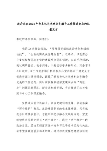 【七哥公文】2024年:政府办在2024年市直机关党建业务融合工作推进会上的汇报发言+更多免费公文+VX:QiGeGongWen2024