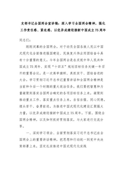 【七哥公文】2024年:支部书记全国两会宣讲稿:深入学习全国两会精神,强化工作责任感、紧迫感,以优异成绩迎接新中国成立75周年+更多免费公文+VX:QiGeGongWen2024
