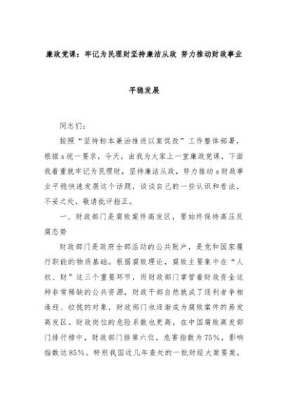【七哥公文】2024年:廉政党课:牢记为民理财坚持廉洁从政 努力推动财政事业平稳发展+更多免费公文+VX:QiGeGongWen2024