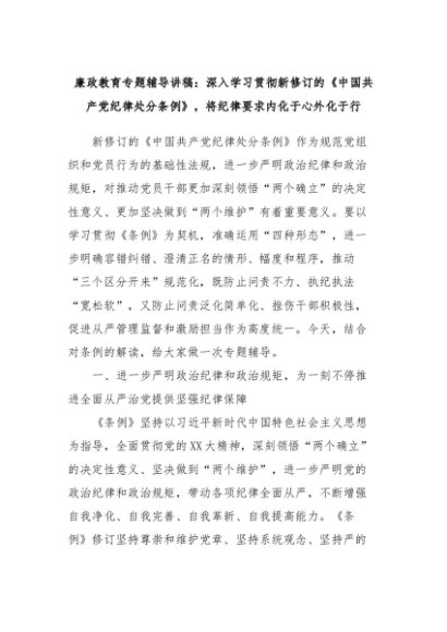 【七哥公文】2024年:廉政教育专题辅导讲稿:深入学习贯彻新修订的《中国共产党纪律处分条例》,将纪律要求内化于心外化于行+更多免费公文+VX:QiGeGongWen2024