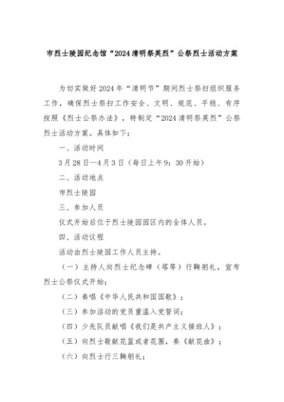 【七哥公文】2024年:市烈士陵园纪念馆“2024清明祭英烈”公祭烈士活动方案+更多免费公文+VX:QiGeGongWen2024