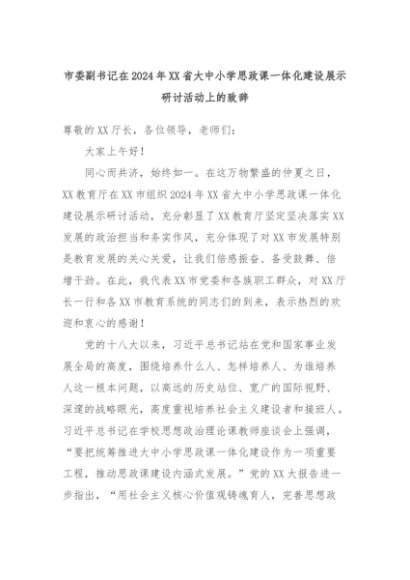 【七哥公文】2024年:市委副书记在2024年XX省大中小学思政课一体化建设展示研讨活动上的致辞+更多免费公文+VX:QiGeGongWen2024