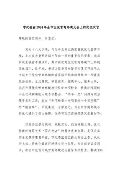 【七哥公文】2024年:市纪委在2024年全市优化营商环境大会上的交流发言+更多免费公文+VX:QiGeGongWen2024