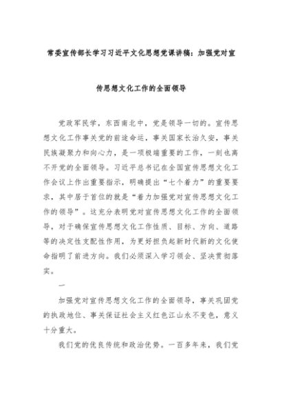【七哥公文】2024年:常委宣传部长学习习近平文化思想党课讲稿:加强党对宣传思想文化工作的全面领导+更多免费公文+VX:QiGeGongWen2024