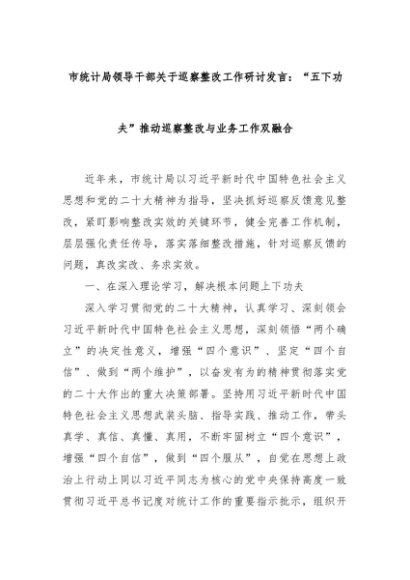 【七哥公文】2024年:市统计局领导干部关于巡察整改工作研讨发言:“五下功夫”推动巡察整改与业务工作双融合+更多免费公文+VX:QiGeGongWen2024