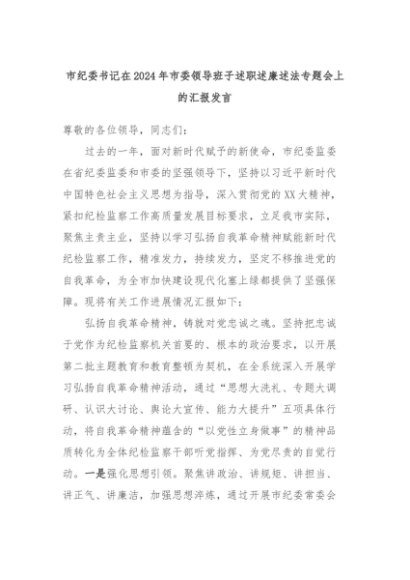 【七哥公文】2024年:市纪委书记在2024年市委领导班子述职述廉述法专题会上的汇报发言+更多免费公文+VX:QiGeGongWen2024