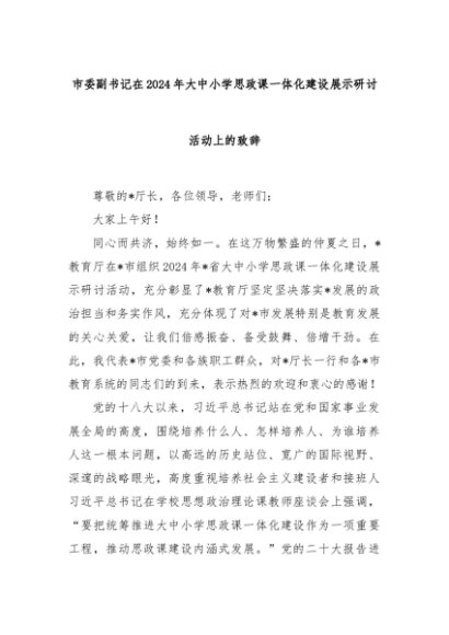 【七哥公文】2024年:市委副书记在2024年大中小学思政课一体化建设展示研讨活动上的致辞+更多免费公文+VX:QiGeGongWen2024
