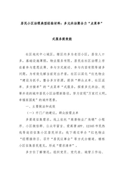 【七哥公文】2024年:居民小区治理典型经验材料:多元共治聚合力“点菜单”式服务提效能+更多免费公文+VX:QiGeGongWen2024