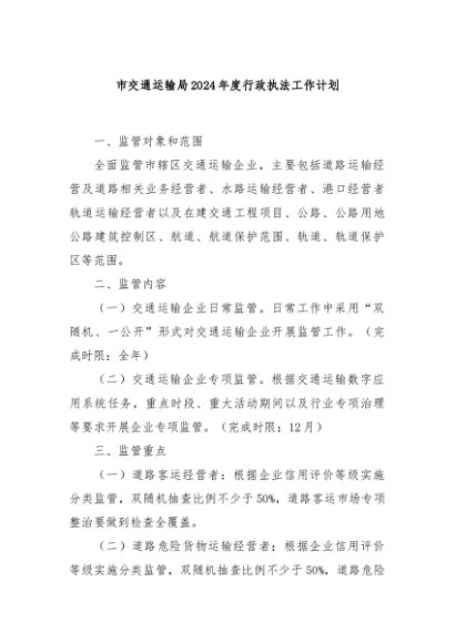 / 【七哥公文】2024年:市交通运输局2024年度行政执法工作计划+更多免费公文+VX:QiGeGongWen2024