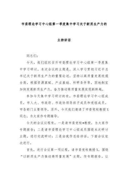 【七哥公文】2024年:市委理论学习中心组第一季度集中学习关于新质生产力的主持讲话+更多免费公文+VX:QiGeGongWen2024