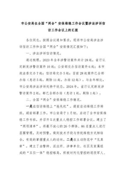 【七哥公文】2024年:市公安局在全国“两会”安保维稳工作会议暨涉法涉诉信访工作会议上的汇报+更多免费公文+VX:QiGeGongWen2024