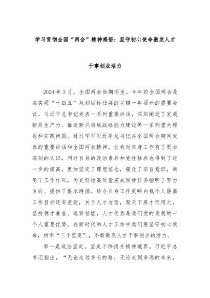 【七哥公文】2024年:学习贯彻全国“两会”精神感悟:坚守初心使命激发人才干事创业活力+更多免费公文+VX:QiGeGongWen2024