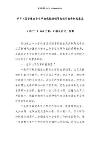 【七哥公文】2024年:学习《关于建立中小学校党组织领导的校长负责制的意见(试行)》体会文章:正确认识这一改革+更多免费公文+VX:QiGeGongWen2024