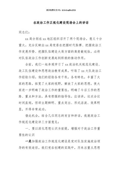 / 【七哥公文】2024年:在政治工作正规化建设现场会上的讲话+更多免费公文+VX:QiGeGongWen2024