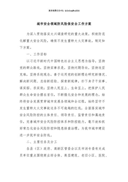 / 【七哥公文】2024年:城市安全领域防风险保安全工作方案+更多免费公文+VX:QiGeGongWen2024
