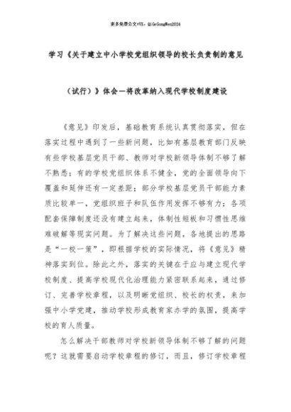 【七哥公文】2024年:学习《关于建立中小学校党组织领导的校长负责制的意见(试行)》体会-将改革纳入现代学校制度建设+更多免费公文+VX:QiGeGongWen2024