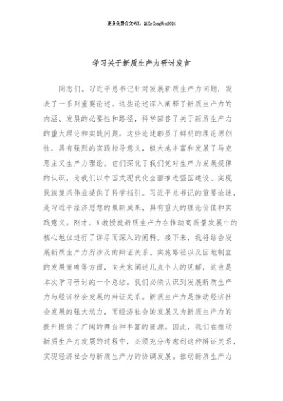 / 【七哥公文】2024年:学习关于新质生产力研讨发言+更多免费公文+VX:QiGeGongWen2024