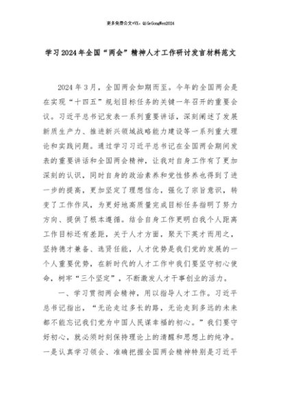 【七哥公文】2024年:学习2024年全国“两会”精神人才工作研讨发言材料范文+更多免费公文+VX:QiGeGongWen2024