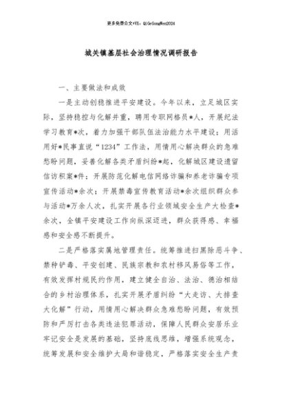 / 【七哥公文】2024年:城关镇基层社会治理情况调研报告+更多免费公文+VX:QiGeGongWen2024