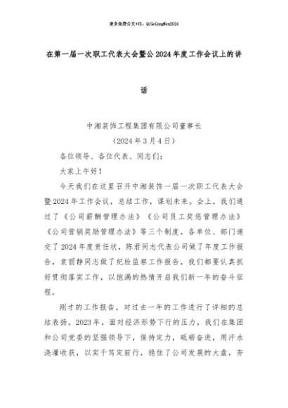 【七哥公文】2024年:在第一届一次职工代表大会暨公2024年度工作会议上的讲话+更多免费公文+VX:QiGeGongWen2024