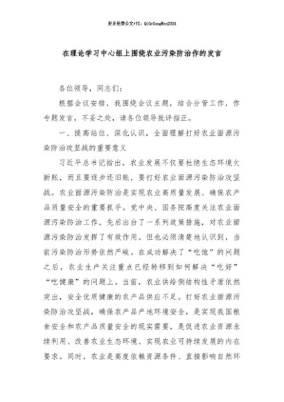 / 【七哥公文】2024年:在理论学习中心组上围绕农业污染防治作的发言+更多免费公文+VX:QiGeGongWen2024