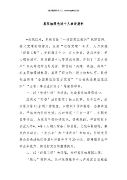 / 【七哥公文】2024年:基层治理先进个人事迹材料+更多免费公文+VX:QiGeGongWen2024