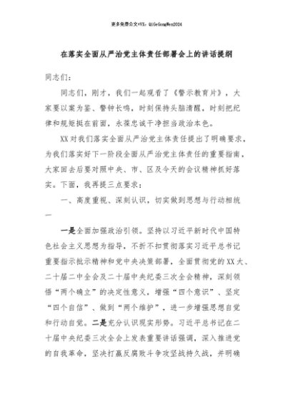 / 【七哥公文】2024年:在落实全面从严治党主体责任部署会上的讲话提纲+更多免费公文+VX:QiGeGongWen2024