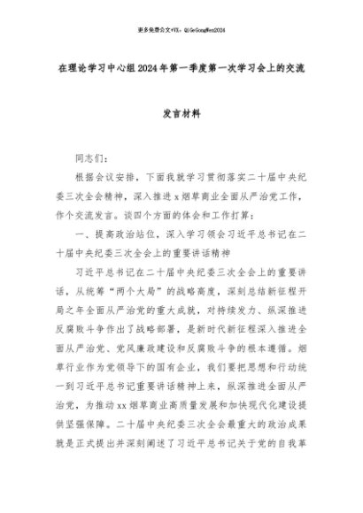【七哥公文】2024年:在理论学习中心组2024年第一季度第一次学习会上的交流发言材料+更多免费公文+VX:QiGeGongWen2024