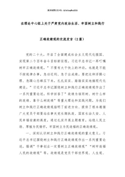 【七哥公文】2024年:在理论中心组上关于严肃党内政治生活、牢固树立和践行正确政绩观的交流发言(2篇)+更多免费公文+VX:QiGeGongWen2024
