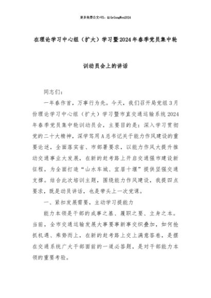 【七哥公文】2024年:在理论学习中心组(扩大)学习暨2024年春季党员集中轮训动员会上的讲话+更多免费公文+VX:QiGeGongWen2024